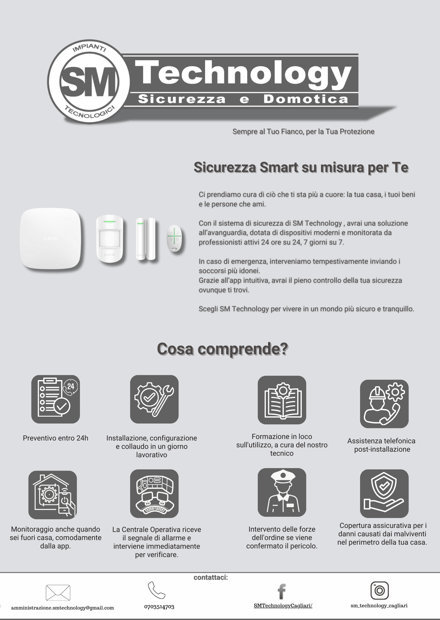 L’installazione e la manutenzione sono incluse nel servizio, assicurando il perfetto funzionamento del sistema in ogni momento. In caso di emergenza, il pulsante SOS consente di richiedere aiuto immediato, attivando un contatto diretto con la Centrale Operativa. Ecco tutti i servizi disponibili con un allarme antifurto installato da SM Technology.