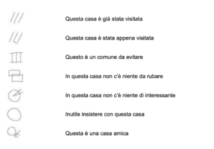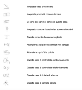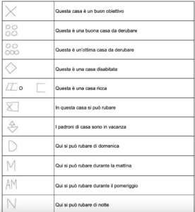 Se ne parla tanto, ma forse non abbastanza. I segni identificativi per furti sono dei simboli tracciati dai ladri. Si tratta di pochi tratti, semplici e veloci da realizzare, con cui il malvivente cataloga quella casa. Questa sorta di alfabeto dei ladri permette al malvivente di ricordarsi l’esito dei suoi sopralluoghi (perché come vedremo tra poco, raramente i ladri improvvisano un colpo senza aver prima studiato la zona) o di comunicare ai complici se e quando un furto in quella casa può essere fatto oppure se è meglio evitare. Ma anche il padrone di casa può notare quei simboli e, se riesce a riconoscerli e ne conosce il significato, si può anche organizzare per evitare che i malandrini possano mettere in atto i loro piani.